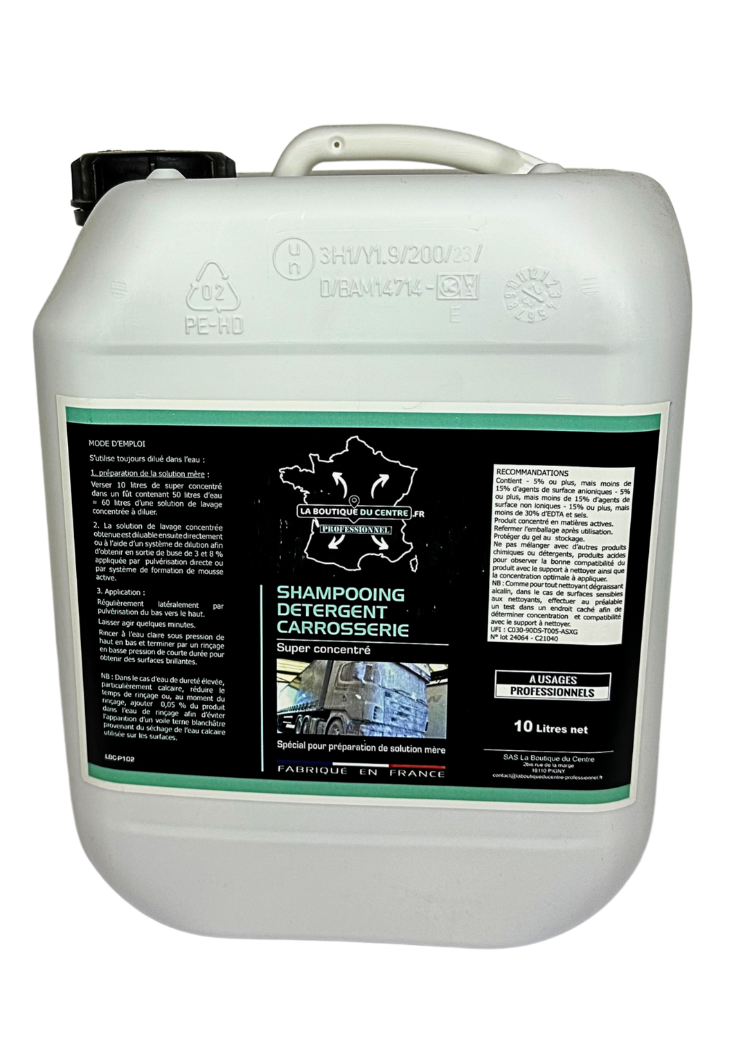 - 4 Bidons de 10L de Shampoing Détergent Ultra Concentré = 240L de préparation de Shampoing concentrée à diluer.